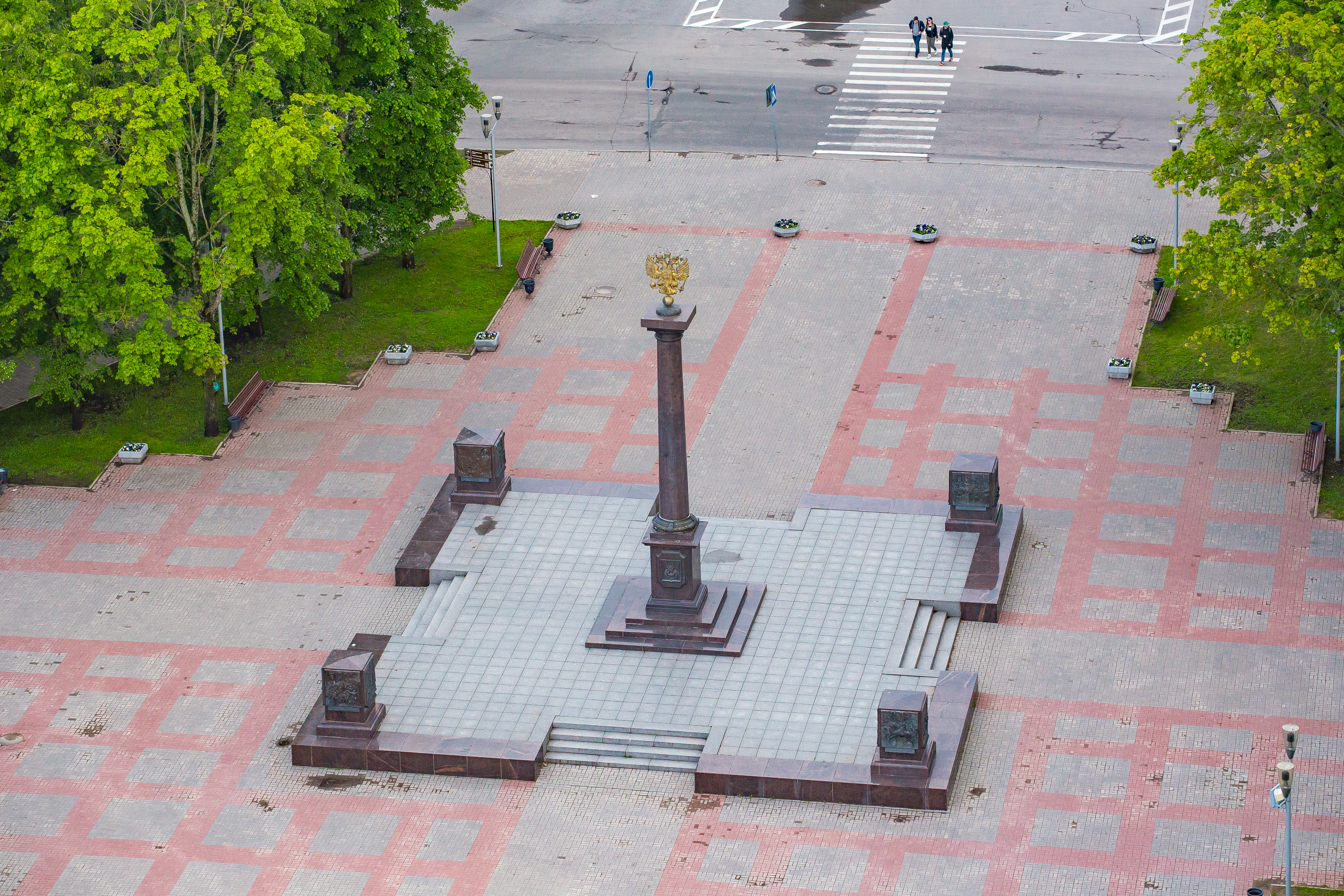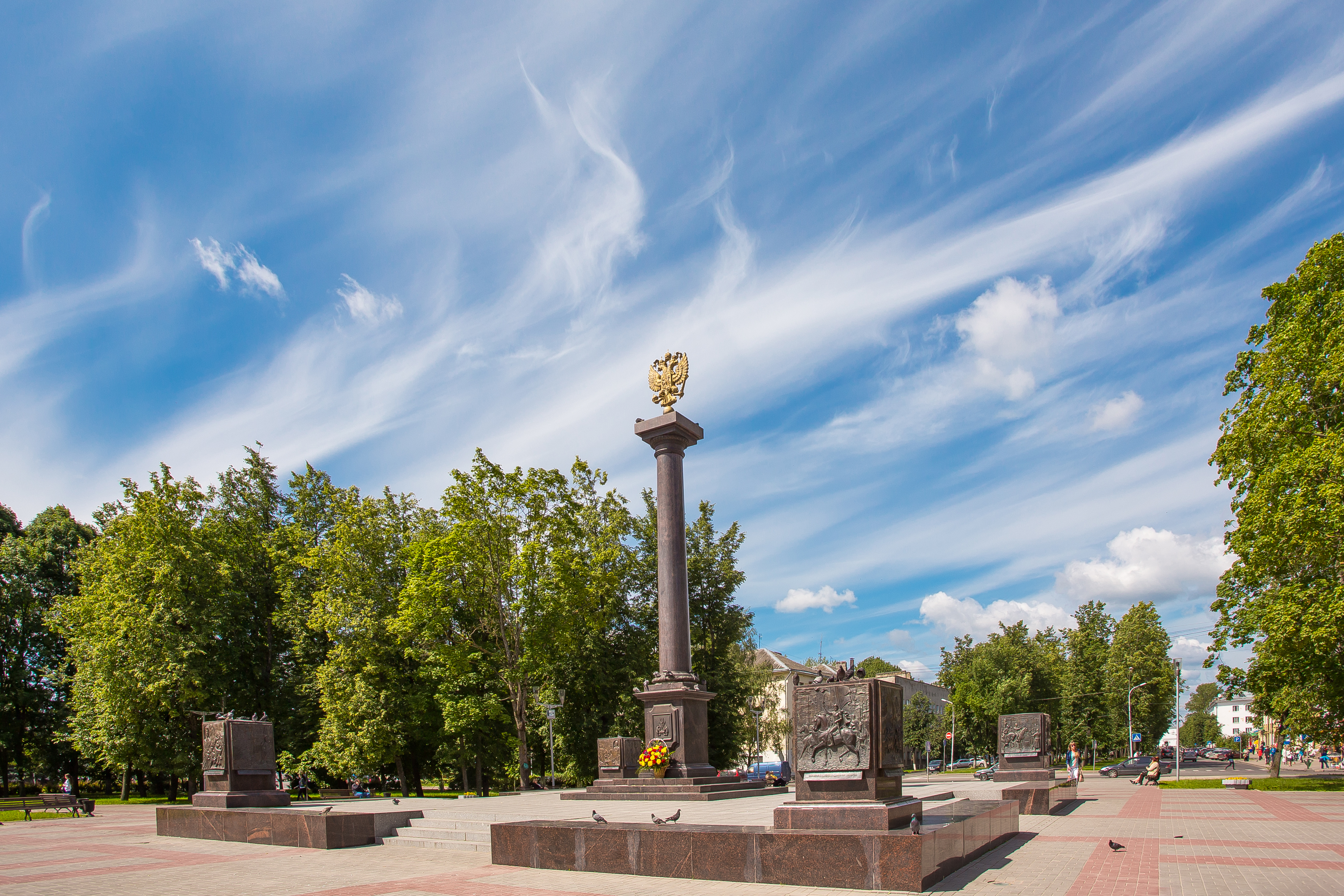На постаменте памятника размещены картуши с текстом указа и гербом Великого Новгорода. Четыре мини-стелы с бронзовыми барельефами, стоящие на углах окружающей памятник площадки, рассказывают о важнейших событиях военной истории Новгородской земли. Каждая из мини-стел посвящена одной из исторических эпох: Древней Руси, Московскому царству, Российской империи, Новейшей истории. Авторами барельефных композиций стали новгородские скульпторы Вадим Боровых и Сергей Гаев.