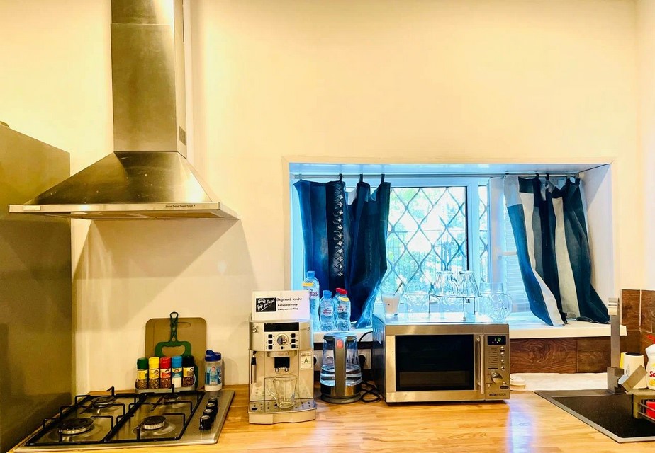 - Кухня с холодильником, плитой и микроволновой печью